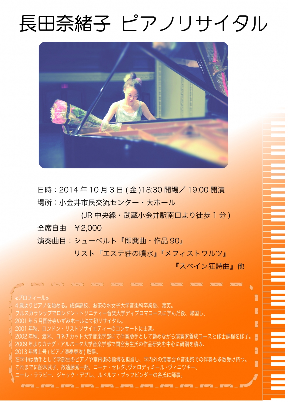 長田奈緒子さん(高・平成5年卒)が下記日時にピアノリサイタルを開催されます。