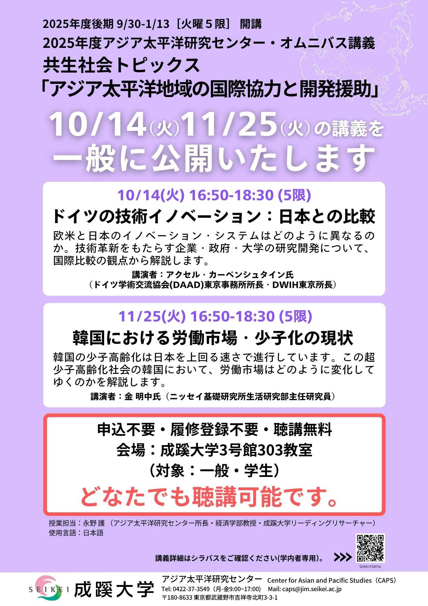 会場・定員 | 成蹊大学3号館303教室 申込不要 ※直接会場にお越しください。 |